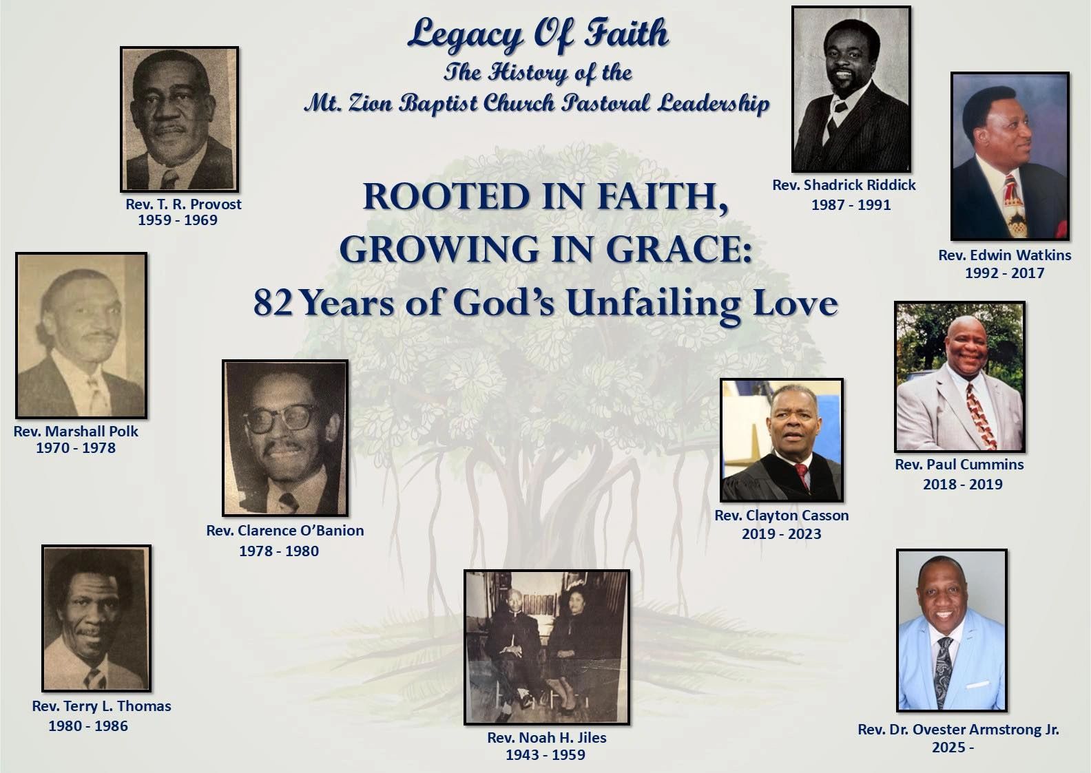 On June 1, 2025, the Lord called Rev. Dr. Ovester Armstrong Jr. as the 9th Pastor of Mt. Zion Baptist Church. God continues to bless the mission and ministry of Mt. Zion Baptist Church as we move forward in serving the Lord.